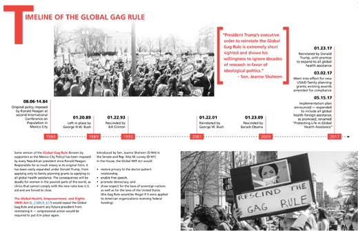 In addition to the Congressional amendments, the executive branch has historically signed two policies addressing abortion and family planning. The one to be discussed here was “The Mexico City Policy” also known as “Protecting Life in Global Health Assistance” (PLGHA) or more recently, in the media as the “The Global Gag Rule” (Blanchfield, 2019). The Mexico City Policy was first passed under President Reagan in 1984. This policy stated no US funds, received by nongovernmental organizations (NGOs) for family planning, could be used for abortive services or involuntary sterilization procedures; however, recipients of US foreign aid could use other money to engage in “abortion-related-activities” (Blanchfield, 2019, pp. 10) if the monies were in separate accounts. Organizations and groups that received USAID grant money were required to sign a contract that stated no US aid would be used perform or promote abortions as a family planning method.