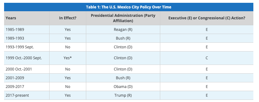 As the presidency has changed between parties, the Mexico City Policy has been revoked and reinstated. Under President George W. Bush, the policy was reinstated but exceptions were put into place to allow abortions. These exceptions were “for cases of rape, incest, conditions that threatened the life of the mother, and for postabortion care” (Blanchfield, 2019, p. 11). He later added an additional exception for funds provided “through the President’s Emergency Plan for HIV/AIDS Relief (PEPFAR), and intergovernmental organizations, such as the United Nations and its affiliated entities” (Blanchfield, 2019, p. 11). The policy was then again revoked by President Obama in 2009.